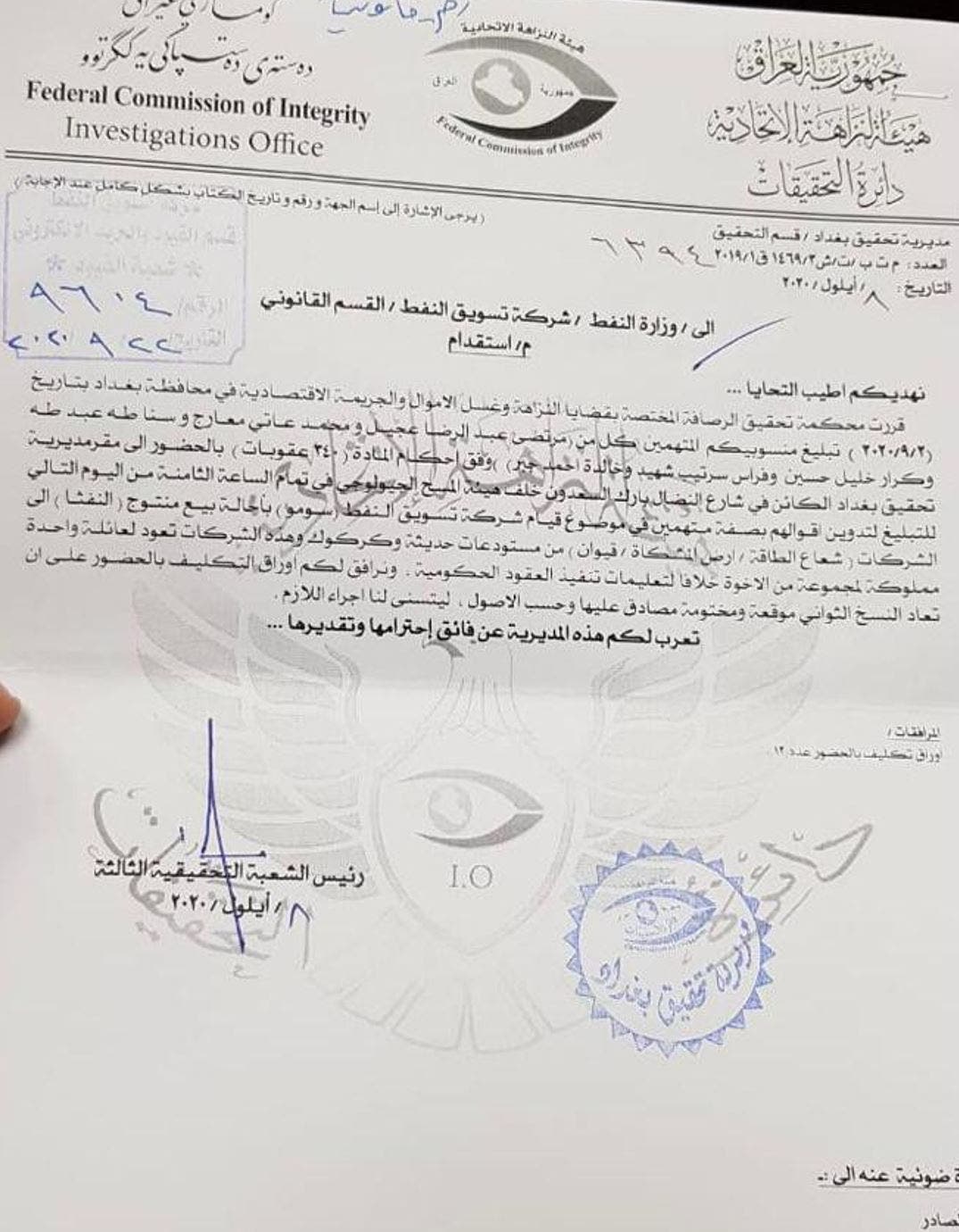 بابەتەک لێرەدا رانەوەستا، دەستەی نەزاهەی عێراق- فەرمانگەی لێکۆڵینەوەکان لە رۆژی ٨ی سێپتێمبەری ٢٠٢٠دا بڕیاریدا لێکۆڵینەوە بکات لەبارەی ئەوەی "کۆمپانیای سۆمۆ فرۆشتنی بەرهەمی نەفتای لە ئەمبارەکانی حەدیسەو کەرکوک داوا بە کۆمپانیاکانی شعاع الگاقەو أرچ المشكاە و قەیوان و ئەم کۆمپانیایانەش خاوەندارێتییان بۆ یەک خێزان دەگەڕێتەوە کە کۆمەڵێک بران، ئەمەش پێچەوانەی رێنمایی پێدانی گرێبەستە حکومییەکانە.