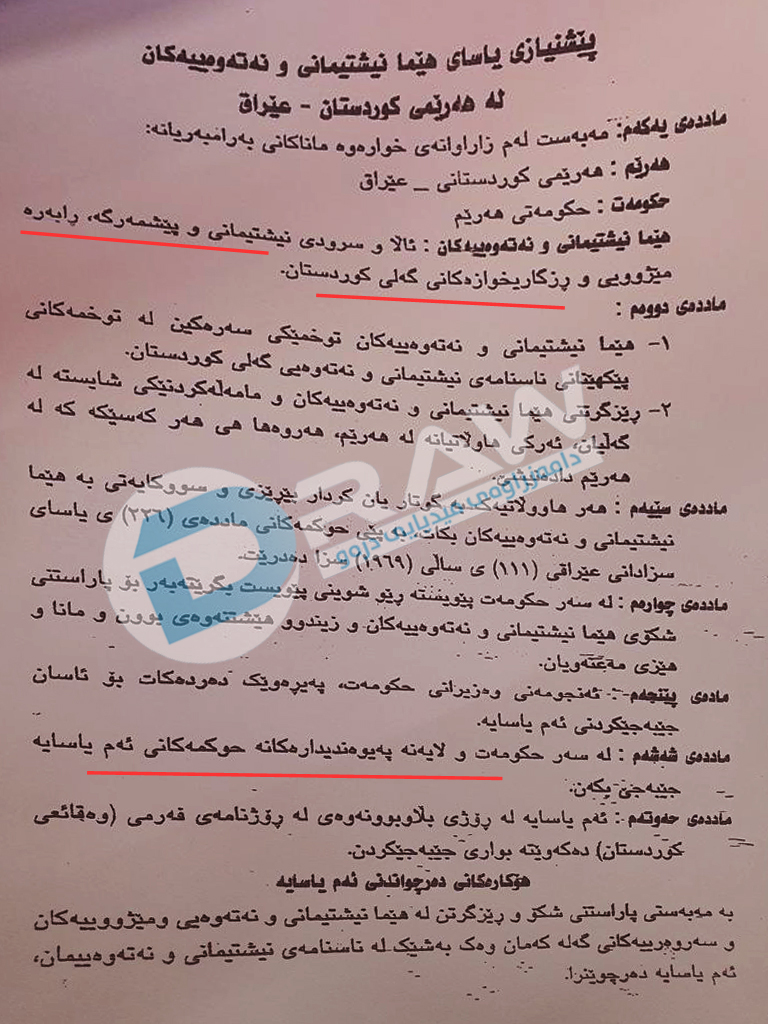 وا لێكدەدرێتەوە لە بنەڕەتەوە هێنانی پرۆژەیاسایەكی لەمجۆرە لەلایەن پارتییەوە، بۆ تەقدیسكردنی (مستەفا بارزانی) رێبەرو دامەزرێنەری پارتی دیموكراتی كوردستان بێت، بەڵام بەپێی پرۆژە یاساكە هێما نیشتمانییەكانی بریتین لەم شتانە: