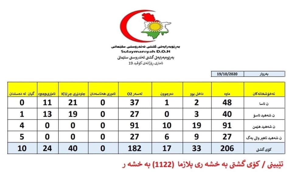بەپێی ئاماری 19/10/2020ی بەرێوەبەرێتی تەندروستی سلێمانی لە كۆی چوار نەخۆشخانەی تایبەت بە كۆرۆنا لەناو شاری سلێمانی دوو نەخۆشخانەیان ( شەهید هێمن ، شەهید تاهیر عەلی والی) هیچ ئامێرێكی هەناسەدان و چاودێری چڕ و ئامێری CPAP تیا نیە لە كۆی 10 نەخۆشی كە بەكۆرۆنا مردوون 9 یان لەو دوو نەخۆشخانەیەن