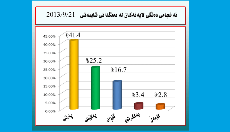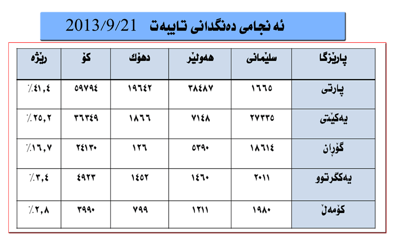 لە هەڵبژاردنی 21/9/2013 دا لەكۆی(154 هەزارو 50 ) كەس  ( 144 هەزار و 434 ) كەس دەنگیان دا بە رێژەی  (93.8% ) بەپێی ئەنجامی كۆتایی دەنگدانی تایبەت لەسەر ئاستی سێ پارێزگاكەی هەرێم بەم شێوەیە بووە: