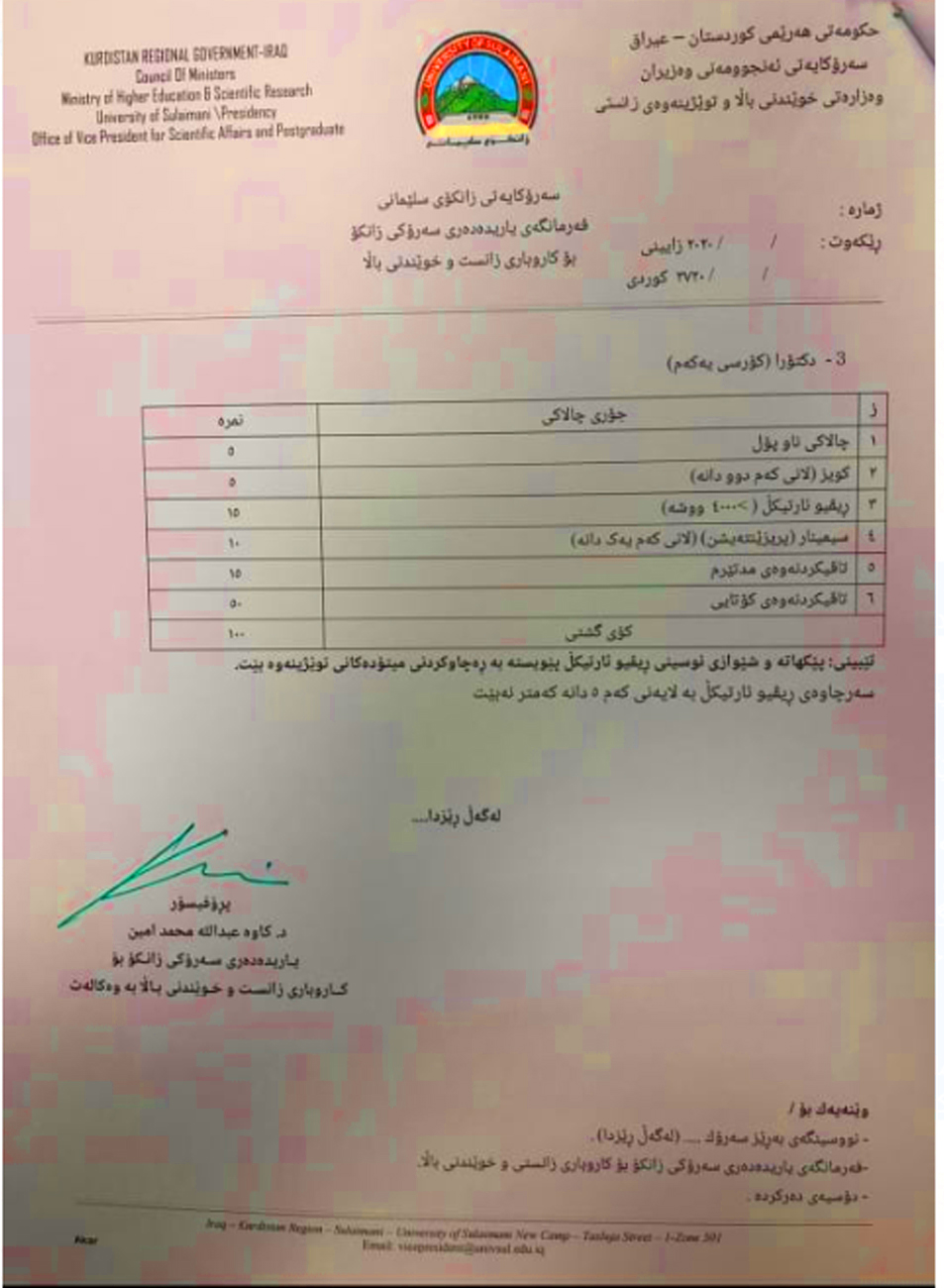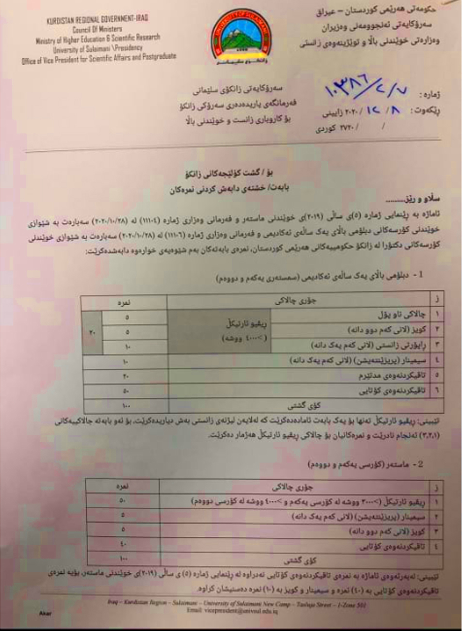 بەپێی ئەو بەڵگەنامانەی لەبەردەستی (درەو)دان، رێنمایی شێوازی خوێندن و دابەشکردنی نمرە، دوای زیاتر لە مانگێك لە دەستپێکردنی خوێندن بەسەر بەش و كۆلێژەكاندا گشتێنراوە، ئەمە لە کاتێکدا بووە لە کۆی (١٤ هەفتە) خوێندکارانی دکتۆرا (٥ هەفتە) یان خوێندووە.