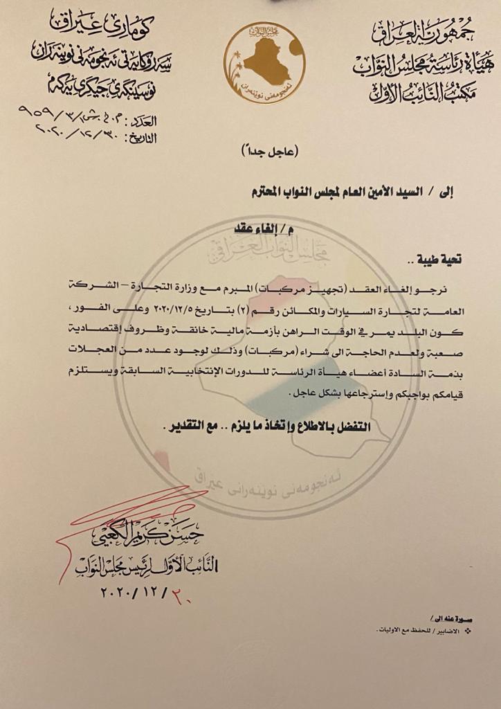 لە نوسراوێکدا کە ئاڕاستەی (سیروان عەبدوڵا سیرینی) ئەمینداری گشتی پەرلەمانی کردووە، حەسەن کەعبی جێگری یەکەمی سەرۆکی پەرلەمانی عێراق داوا دەکات گرێبەستی دوو ئۆتۆمبیل هەڵوەشێندرێتەوە کە بۆ ئەمینداری پەرلەمان کڕدراون.