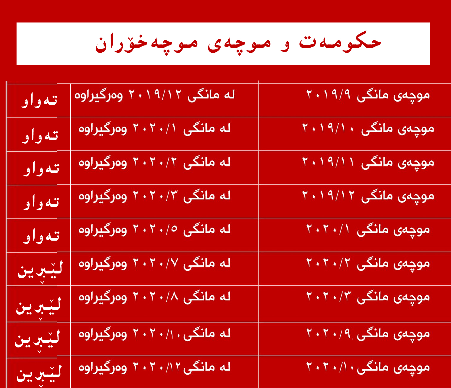 • لە 9/ تا 7/3/2020 موچەی مانگی (11)ی 2019 دابەشكراوە (ئەم مانگە موچەی تەواو بەفەرمانبەران دراوە بەبێ لێبڕین)