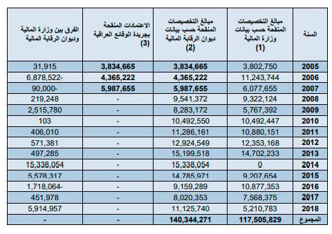 خشتەی ژمارە (3) پوختەی پارەی تەرخانكراو بۆ هەرێم روندەكاتەوە بە گوێرەی داتای وەزارەتی داراییو داتای دیوانی چاودێری دارایی: