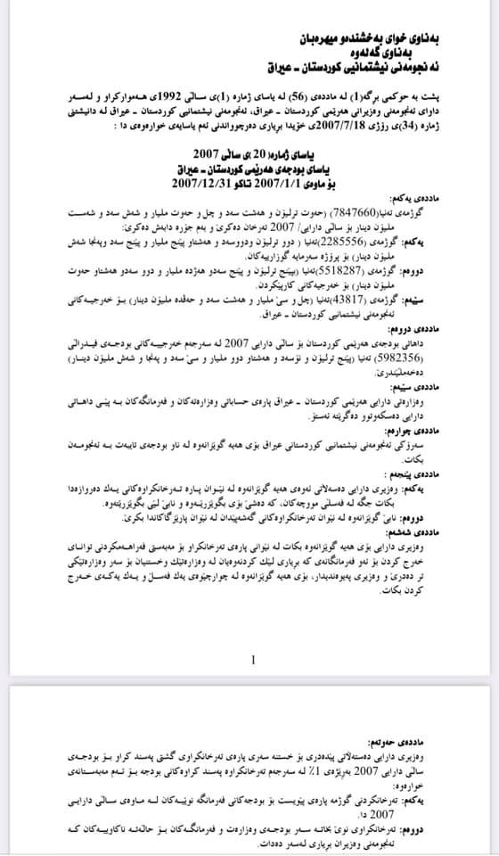 یاسای ژمارە(٢٠)ی ساڵی ٢٠٠٧ یاسای بودجەی هەرێمی کوردستان_ عیراق بۆ ماوەی ٢٠٠٧/١/١ تاکو ٢٠٠٧/١٢/٣١