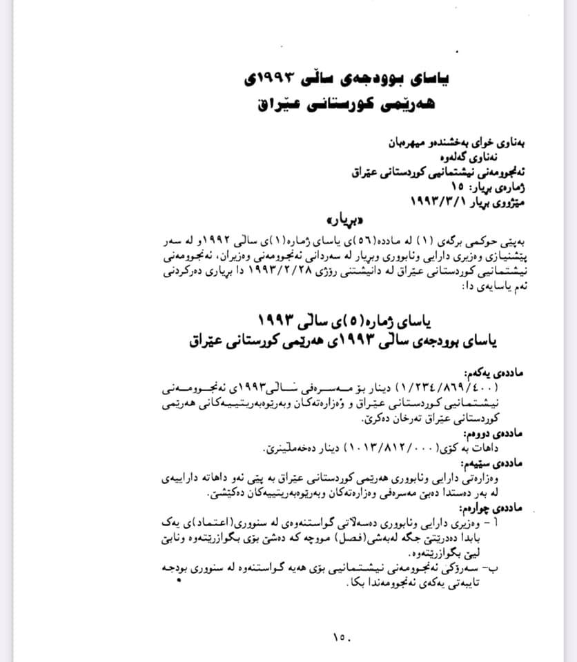 بە یاسایی ژمارە ٥ بودجەی ساڵی ١٩٩٣ کە لە خوارەوە ئاماژەم بە ناوڕۆکی یاساکە کردوە بەم شێوازە بوە:-