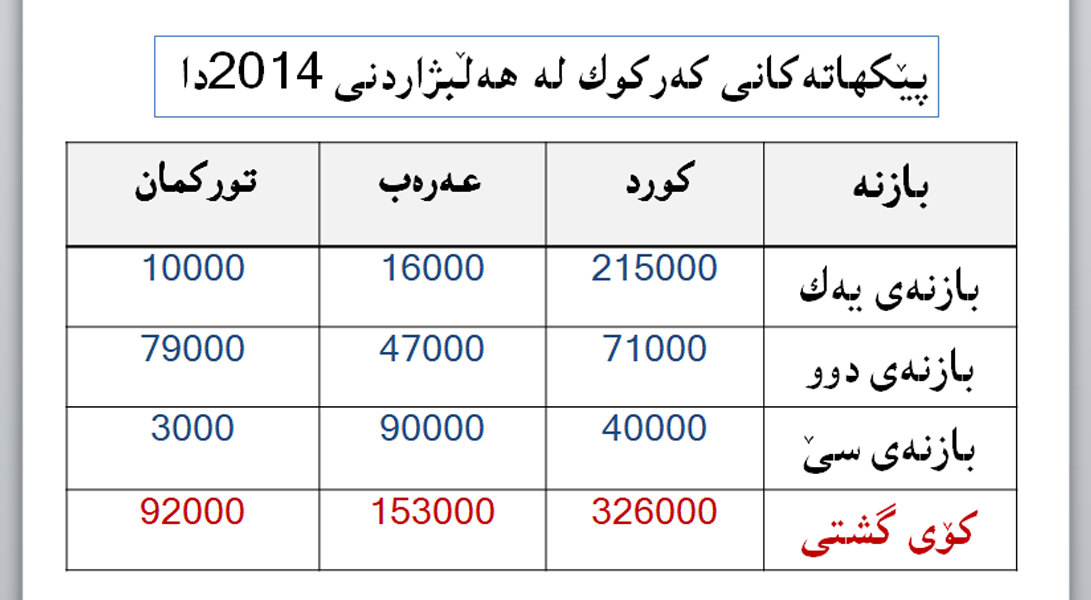 بەگوێرەی ئەنجامی هەڵبژاردنی پەرلەمانیی ساڵی 2014، لەم بازنەیەدا دەنگی پێكهاتەكانی كەركوك بەمشێوەیە بووە:
