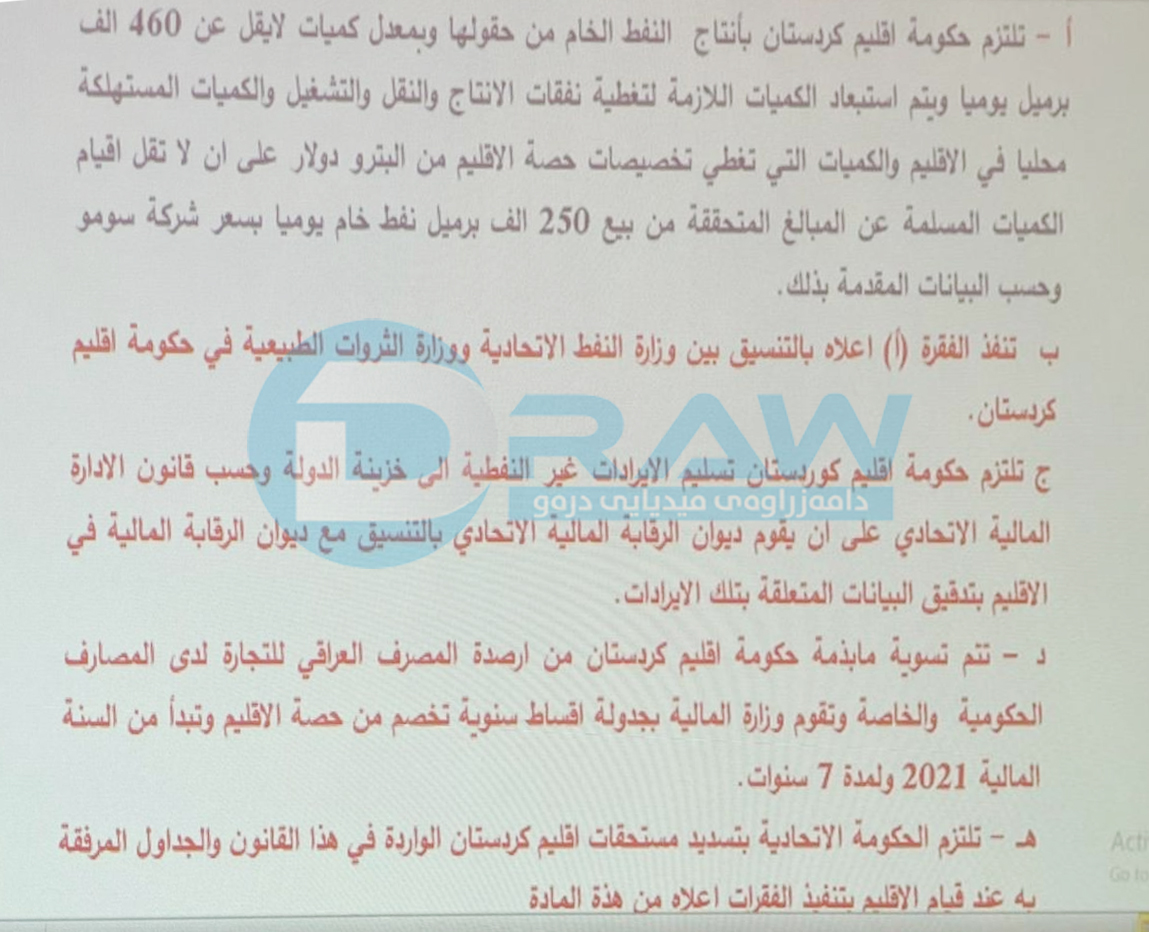 (درەو) وێنەیەکی پێشنیازی نوێی لایەنە شیعەکانی بۆ رێککەوتن دەستکەوتووە، بەپێی ئەو هەموارە نوێیە، شیعەکان مەرجیان داناوە ئەگەر هەرێم پابەند نەبێت بە رێککەوتنەکەوە، حکومەتی بەغداد هیچ بڕە پارەیەک بۆ کوردستان نەنێرێت.