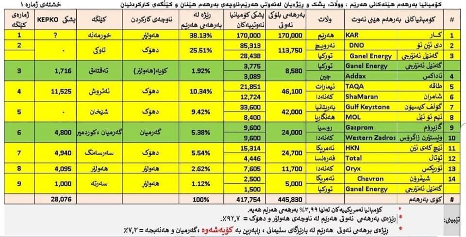 ئەم خشتەیە كێڵگە نەوتییەكانی سنوری دەسەڵاتی پارتی و یەكێتیە بەڵام ژمارەی بەرمیلە نەوتییەكان هەندێك گۆڕانكارییان تێدا هاتووە چونكە خشتەكە هی ساڵی رابردووە