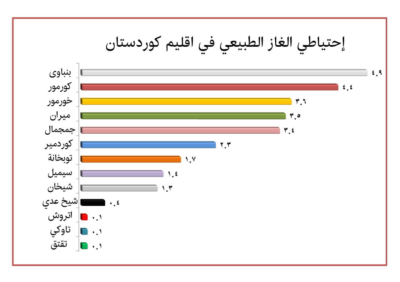 وتزامن بحث لهيئة المسح الجيولوجي الامريكي يفيد ان اقليم كوردستان يمتلك اكثر من (60) ترليون متر مكعب من الغاز الطبيعي. كما اعلن (توني هيوارد) رئيس شركة كَنَل إنرجي التركية في عام 2015، يمكن تقدير ان اقليم كوردستان يمتلك (5) ترليونات متر مكعب من الغاز الطبيعي ما يساوي قرابة (177) ترليون قَدَم مكعب.