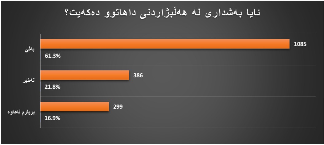 بەپێی ڕاپرسییەکی ناوەندی بەیان بۆ لێکۆڵینەوەو پلاندانان، کە لەسەر ئاستی سەرجەم پارێزگاکانی عێراق و بەشداری (١٧٧٠) کەس لە سەرجەم چین و توێژ و ئاستە جیاوازەکانی تەمەن و ڕەگەز و نەتەوەو شێوازی گوزەران و پلەی خوێندەواری ئەنجامی داوە، دەیان پرسیاری جۆراو جۆریان لە بارەی هەڵبژاردنەوە ئارستە کراوە، گرنگترینی ئەوانە؛