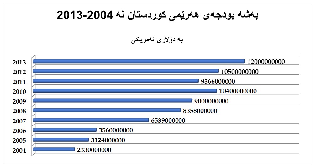 ئەوەی لە نێوان ساڵانی (2007-2013) بودجەی هەرێمی کوردستان بە یاسا ڕێکخراوە، پەیوەندیداەو بەو هاتنی پشکی هەرێمی کوردستان لە بەغدادەوە، بەپێی سەرچاوەکان ئەو پارانەی دەست حکومەتی هەرێم کەوتووە لە ڕێگەی بەشە بودجەی هەرێم لە حکومەتی فیدراڵ، کە لە ساڵی 2004ەوە تا ساڵی 2014 بەردەوام بوو نزیکەی (75) ملیار دۆلار بووە، بەڵام لەدوای ساڵی 2014ەوە حکومەتی هەرێم سەربەخۆیی ئابوری ڕاگەیاند، حکومەتی عێراقیش بەشە بودجەی هەرێمی ڕاگرت، ئەویش بەو جۆرە بووە؛ (بڕوانە چارتی ژمارە (3))