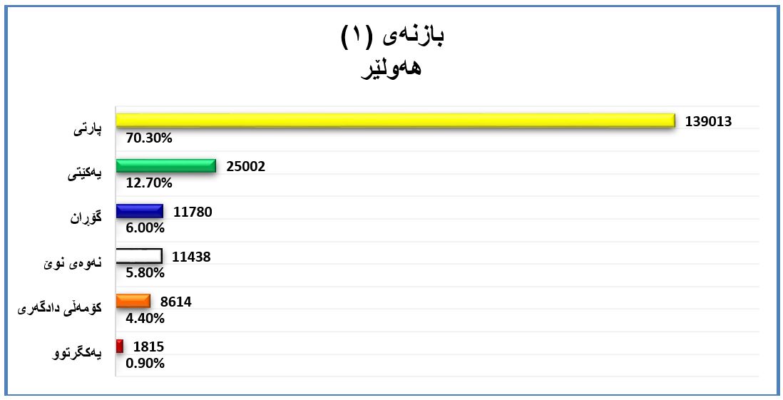 بازنەی (1): کە ناسێنراوە بە بازنەی (سۆران + مێرگەسور + رەواندز + چۆمان + شەقلاوە)، دەنگی لایەنە سەرەکییەکانی پارێزگای هەولێر لەسەر بنەمای هەڵبژاردنی ٣٠ی ٩ی٢٠١٨بەم شێوەیەن (بڕوانە چارتی ژمارە (١))