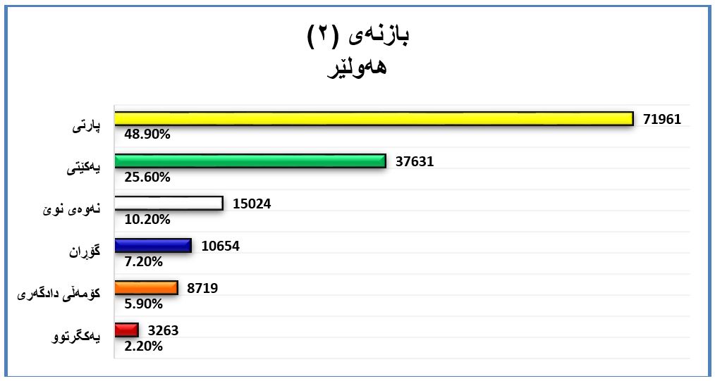 بازنەی (2): کە ناسێنراوە بە بازنەی ( دەشتی هەولێر+ كۆیە + خەبات)، دەنگی لایەنە سەرەکییەکانی پارێزگای هەولێر لەسەر بنەمای هەڵبژاردنی ٣٠ی ٩ی٢٠١٨بەم شێوەیەن (بڕوانە چارتی ژمارە (٢))