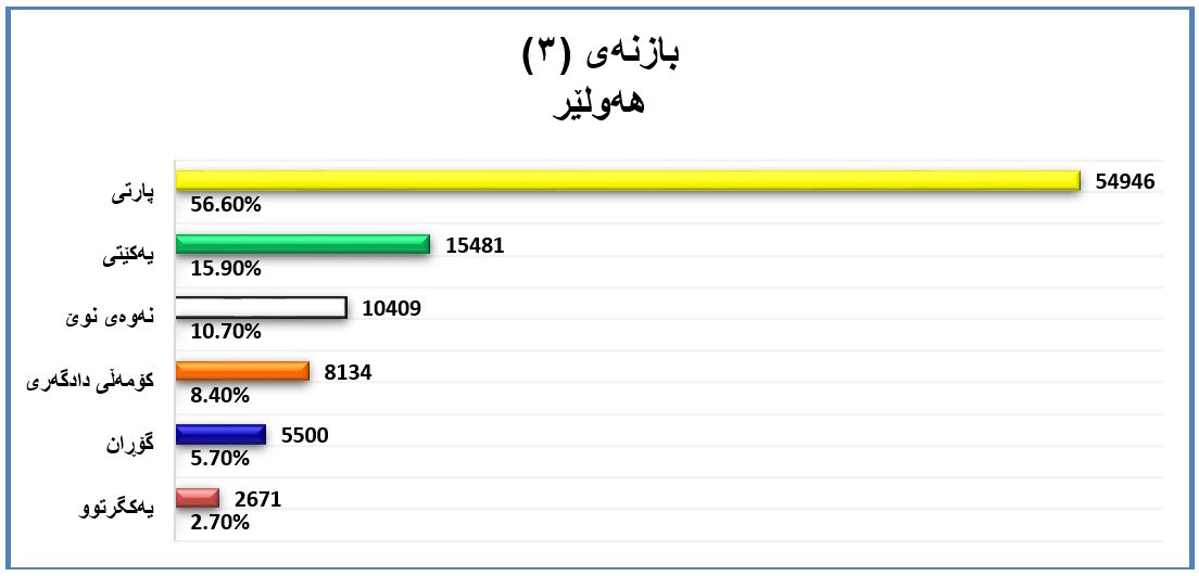 بازنەی (3): کە ناسێنراوە بە بازنەی (بەشی خۆرئاوای قەزای هەولێر)، دەنگی لایەنە سەرەکییەکانی پارێزگای هەولێر لەسەر بنەمای هەڵبژاردنی ٣٠ی ٩ی٢٠١٨بەم شێوەیەن (بڕوانە چارتی ژمارە (٣))
