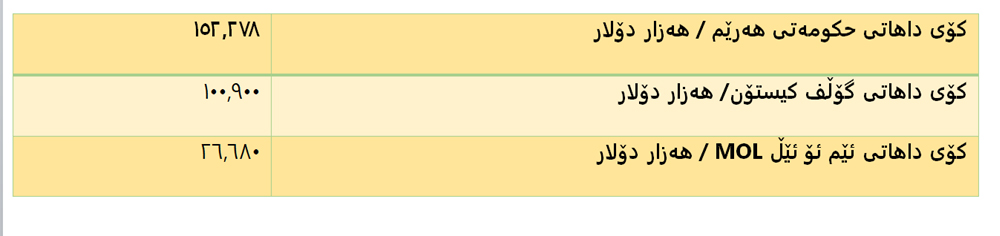 ٢- پشکی حکومەت لەبەرهەم: هەرێم بڕی ٥ ملیۆن و ٥٠١ هەزار بەرمیل نەوتی لە کۆمپانیا نەوتییەکان وەکو پشکی هەرێم وەرگرتووە کە کردوویەتییە ١١٤ ملیۆن و ٨٥٤ هەزار دۆلار. هەریەک لە کۆمپانیاکان بەم شێوەیە بەشداربوون لە پێدانی پشکی نەوت بە هەرێم لە کێڵگەکە: