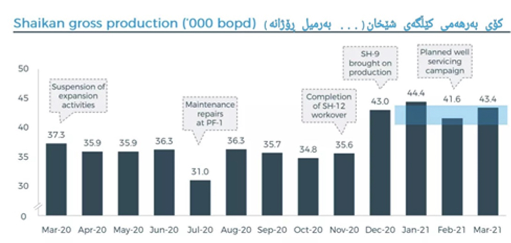 تا کۆتایی ساڵی ٢٠٢٠ هەرێم بڕی ٦ ملیۆن و ٨٤١ هەزار بەرمیل نەوتی وەرگرتووە لە کێڵگەی شێخان و بڕی ١٥٢ ملیۆن و ٢٧٨ هەزار دۆلار پشکی هەرێم بووە.