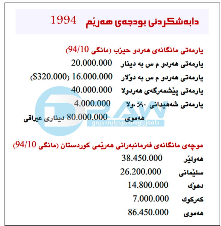 بەپێی قسەی نەوشیروان مستەفا، مانگی تشرینی یەكەمی ساڵی 1994 لەسەروبەندی شەڕی ناوخۆدا، خەرجی موچەی مانگانەی موچەخۆرانی هەرێمی كوردستان (86 ملیۆنو 450 هەزار) دیناری سویسری بووە، بەڵام پارتیو یەكێتی بەهەردووكیان مانگانە لە بودجەی حكومەت بڕی (80 ملیۆن) دیناری سویسرییان بردووە.