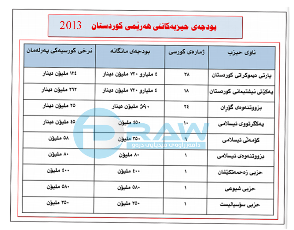 ساڵی 2013 كە هەرێمی كوردستان دواین یاسای بودجەی هەبووە، پارەی حزبە سیاسییەكان بەمشێوەیەو لە دەرەوەی یاسای بەركار دابەشكراوە: