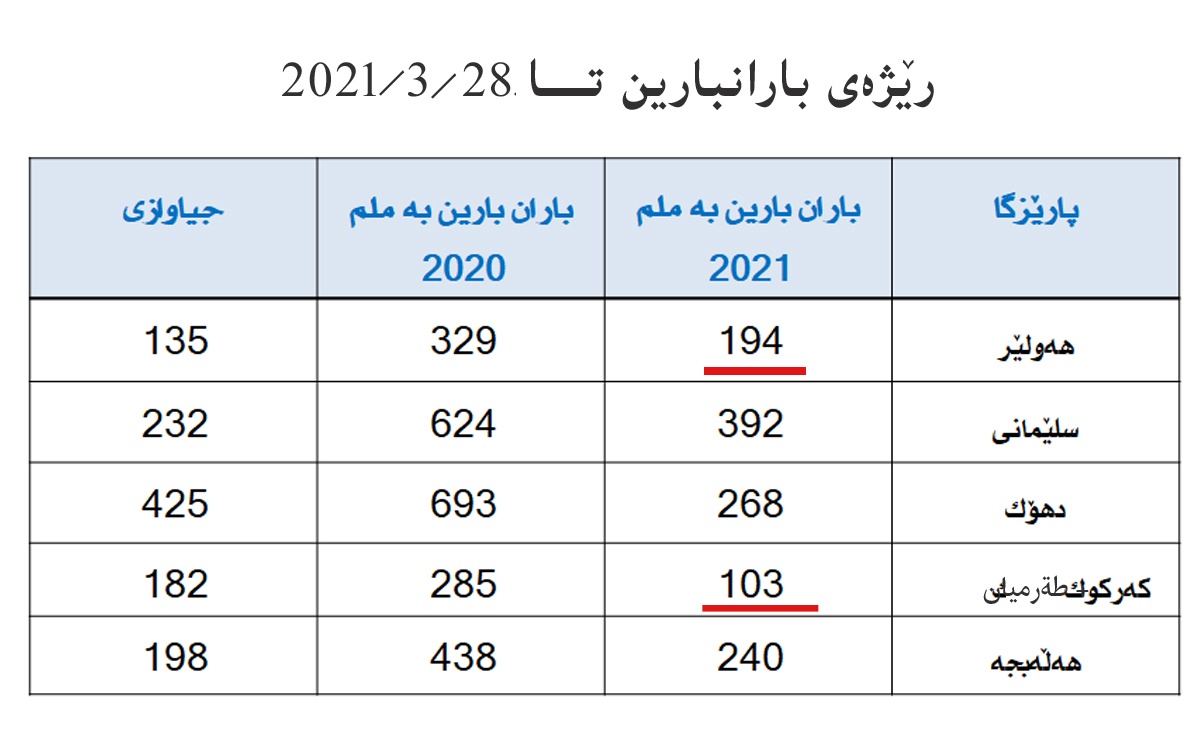 رێژەی بارانبارین لەهەرێمی كوردستان لە هیچ ناوچەیەكدا نەگەیشتووەتە (٥٠٠) ملم، بەپێی ئاماری بەڕێوەبەرێتی كەشناسیی، رێژەی بارانباران بەبەراورد بە ساڵی رابردوو (٥٠٪) كەمیكردووە، زۆرترین رێژەی بارانبارین لەپارێزگای سلێمانییە كە تاوەکو رۆژی ٢٨ی ئازاری ئەمساڵ نەگەیشتووەتە (٤٠٠) ملم و كەمترینی بڕی بارانبارین لە ناوچەی كەركوك- گەرمیانە كە (١٠٣) ملم باریوە، لە هەولێریش رێژەکە نەگەیشتووتە (٢٠٠) ملم.