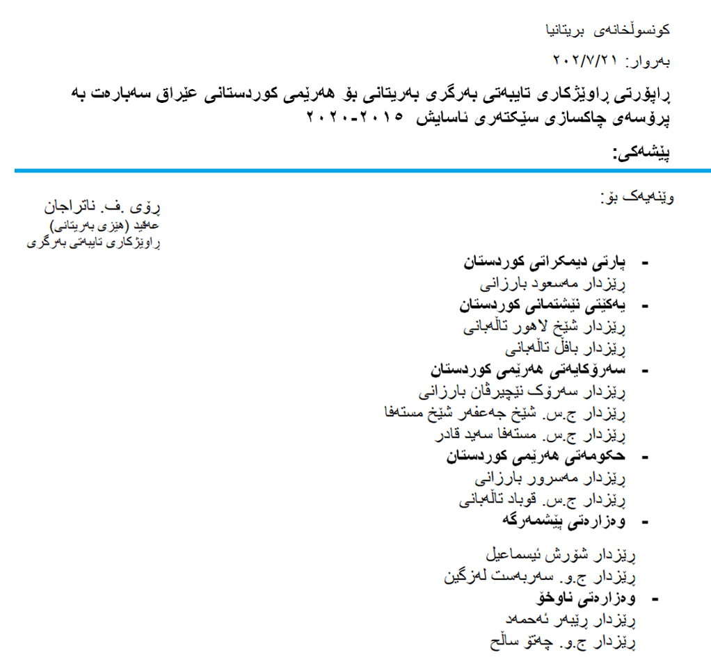 بەریتانیا بەڕووی پێشنیاز بۆ حكومەتی هەرێمی كوردستان دەكات "پێداچوونەوەیەكی فراوان بە پۆستی ئەفسەرە باڵاكان بكات تاوەكو بتوانێت هەندێكیان خانەنشین بكاتو ئەفسەرە گەنجەكان ئەوانەی كە بەهرەدارنو چاكسازیان دەوێت، لە پۆستە سەرەكییەكاندا دامەزرێنرێن".