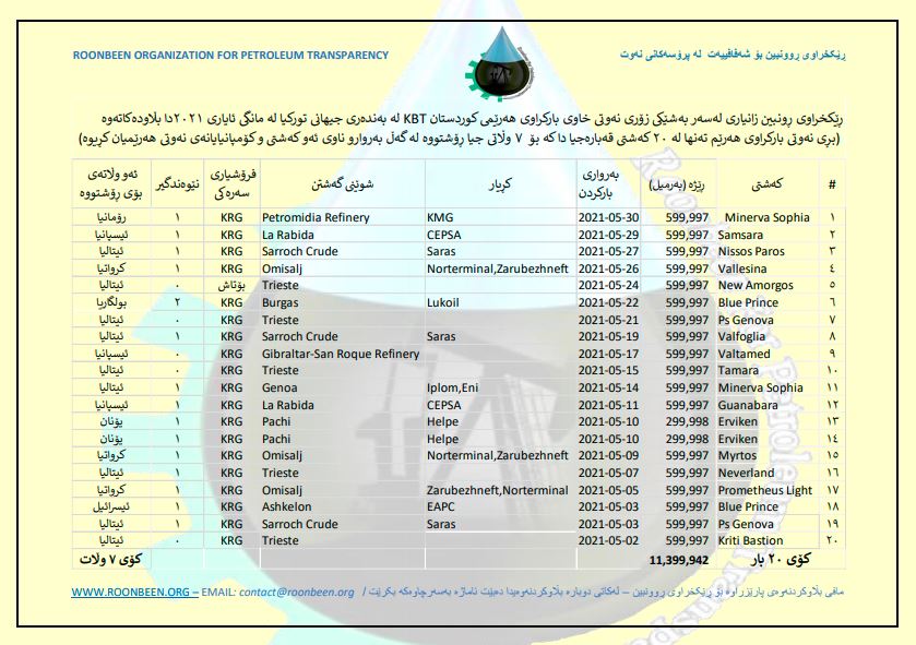 بەپێی راپۆرتی رێكخراوی روونبین بۆ شەفافیەت لە پرۆسەكانی نەوت، حكومەتی هەرێمی كوردستان لە مانگی ئایاری 2021 بڕی ( 11 ملیۆن و 399 هەزارو 942) بەرمیل نەوتی باركردووە لە بەندەری جەیهانی توركیا كە بە(20) كەشتی قەبارە جیاواز بە (7) وڵاتی فرۆشتووە.