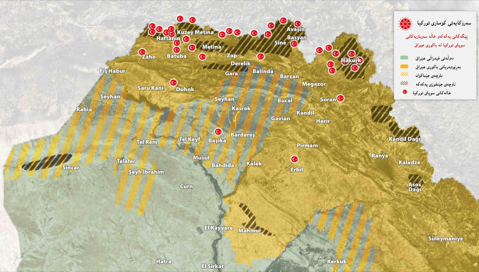 بەر لە ساڵیك سەرۆکایەتیی کۆماری تورکیا نەخشەی هێزەکانی لە هەرێمی کوردستان لە پێگەکی فەرمی خۆی لە تویتەر بڵاو کردبوویەوە بەڵام لە رۆژی ٦/٧/٢٠٢٠ نەخشەکەی سڕییەو بڕوانە نەخشەی ژمارە (١)، بە پێی نەخشەکە خاڵە سەربازییەکانی تورکیا لە سنووری سۆرانەوە لە باکووری رۆژهەڵاتی هەرێمی کوردستانەوە تاوەکو سنووری زاخۆ لە باکووری رۆژئاوای هەرێمی کوردستان لەخۆدەگرێت، هاوکات سێ خاڵی سەربازیشی لە نزیک هەولێر و باشیک و دهۆک دەستنیشان کردووە. ئەمە لە کاتێکدایە کردنەوەی ئەو بنکە سەربازییانە لەدەرەوەی ڕەزامەندی حکومەتی عێراقدایە و بەشێک لەو بنکانە مێژووی بونیادنیان دەگەڕێتەوە بۆ سەردەمی شەڕی ناوخۆی نێوان یەکێتی و پارتی لە ساڵی (١٩٩7) بەدواوە بۆ بەلاداخستنی شەڕی ناوخۆ هاتنە سنورەکەو هەرگیز نەگەڕانەوە.