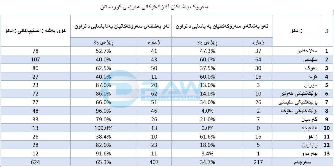 لەكۆی (624) بەشی زانكۆكانی هەرێمی كوردستان (407) سەرۆكی بەشیان بە نایاسایی و لەدەرەوەی یاسا دانراون كە دەكاتە (65%)ی كۆی سەرۆك بەشەكانی زانكۆكانی هەرێمی كوردستان و (217) سەرۆكی بەش بەیاسایی دانراون كە دەكاتە (35%)، لەزانكۆی سەڵاجەدین لەكۆی (78) سەرۆكی بەش (37) سەرۆك بەشیان بە یاسایی دانراون بەرێژەی (47%) و (41) سەرۆك بەشیان بەنایاسایی دانراون (53%)، لە زانكۆی سلێمانی لەكۆی (107) سەرۆكی بەش (64) سەرۆك بەشیان بە یاسایی دانراون بەرێژەی (60%) و (43) سەرۆك بەشیان بەنایاسایی دانراون (40%)، زانكۆی هەڵەبجە (100%) سەرۆك بەشەكان بە نایاسایی دانراون، زانكۆی پولیتەكنیكی دهۆك (96%) ی سەرۆك بەشەكان بە نایاسایی دانراون. بڕوانە خشەی ژمارە (٢)، بە جۆرێک؛
