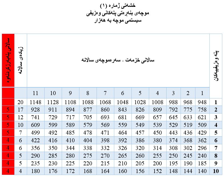 (مادەی سێیەم) بڕگەی یەکەم: پلەکانی فەرمانبەران و سەرمووچەی ساڵانەیان و ماوەی پلە بەرزکردنەوەیان بەم شێوەیە دەبێت کە لە خشتەی مووچەکان و سەرمووچەی ساڵانە هاتووە (بڕوانە خشتەی ژمارە (1))