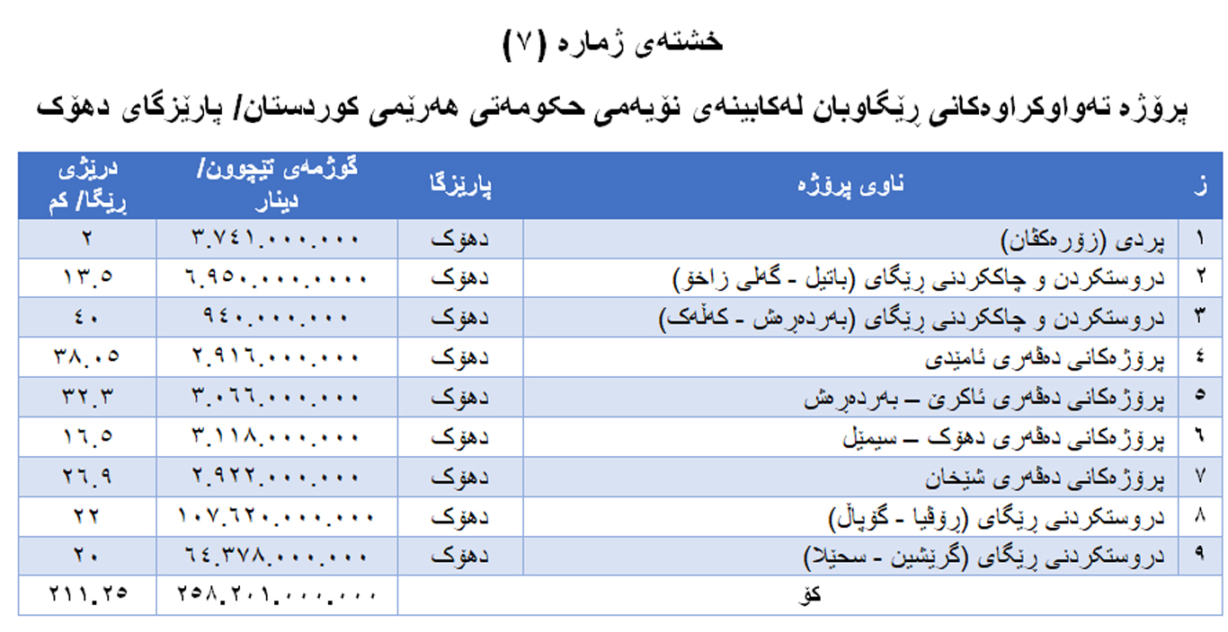 پارێزگای دهۆک لە ڕووی پێشکەشکردنی پرۆژەکانی ڕێگاوبان لەدوای پارێزگاکانی هەولێرو لە پێش پارێزگای سلێمانییەوە دێت و بەجۆرێک ئەو پرۆژانەی لەپارێزگای دهۆک تەواو کراون، ژمارەیان (9) پرۆژەیە و گوژەمەی تێچونەکەیان (258 ملیارو 201 ملیۆن) دینارە، پێوانەی گشتی ڕێگاکان بریتییە لە (211.25)کیلۆمەتر. بۆ وردەکاری (بڕوانە خشتەی ژمارە (7)).