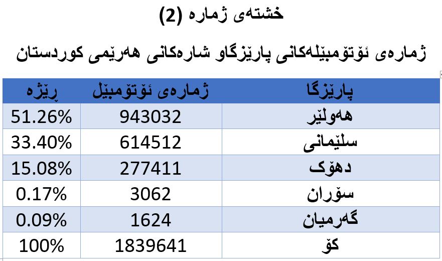 زۆرترین ژمارەی ئۆتۆمبێل لە هەرێمی کوردستان دەکەوێتە پارێزگای هەولێرەوەو پارێزگای سلێمانی بە پلەی دووەم و پارێزگای دهۆک بەپلەی سێیەم دێت، (بڕوانە خشتەی ژمارە (2))