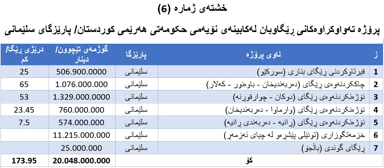 پارێزگای سلێمانی لە ڕووی پێشکەشکردنی پرۆژەکانی ڕێگاوبان لەدوای هەریەک لە پارێزگاکانی هەولێرو دهۆکەوە دێت و بەجۆرێک ئەو پرۆژانەی لەپارێزگای سلێمانی تەواو کراون، ژمارەیان تەنها (7) پرۆژەیە و گوژەمەی تێچونەکەیان (20 ملیارو 48 ملیۆن) دینارە، پێوانەی گشتی ڕێگاکان بریتییە لە (173.95)کیلۆمەتر. بۆ وردەکاری (بڕوانە خشتەی ژمارە (6)).