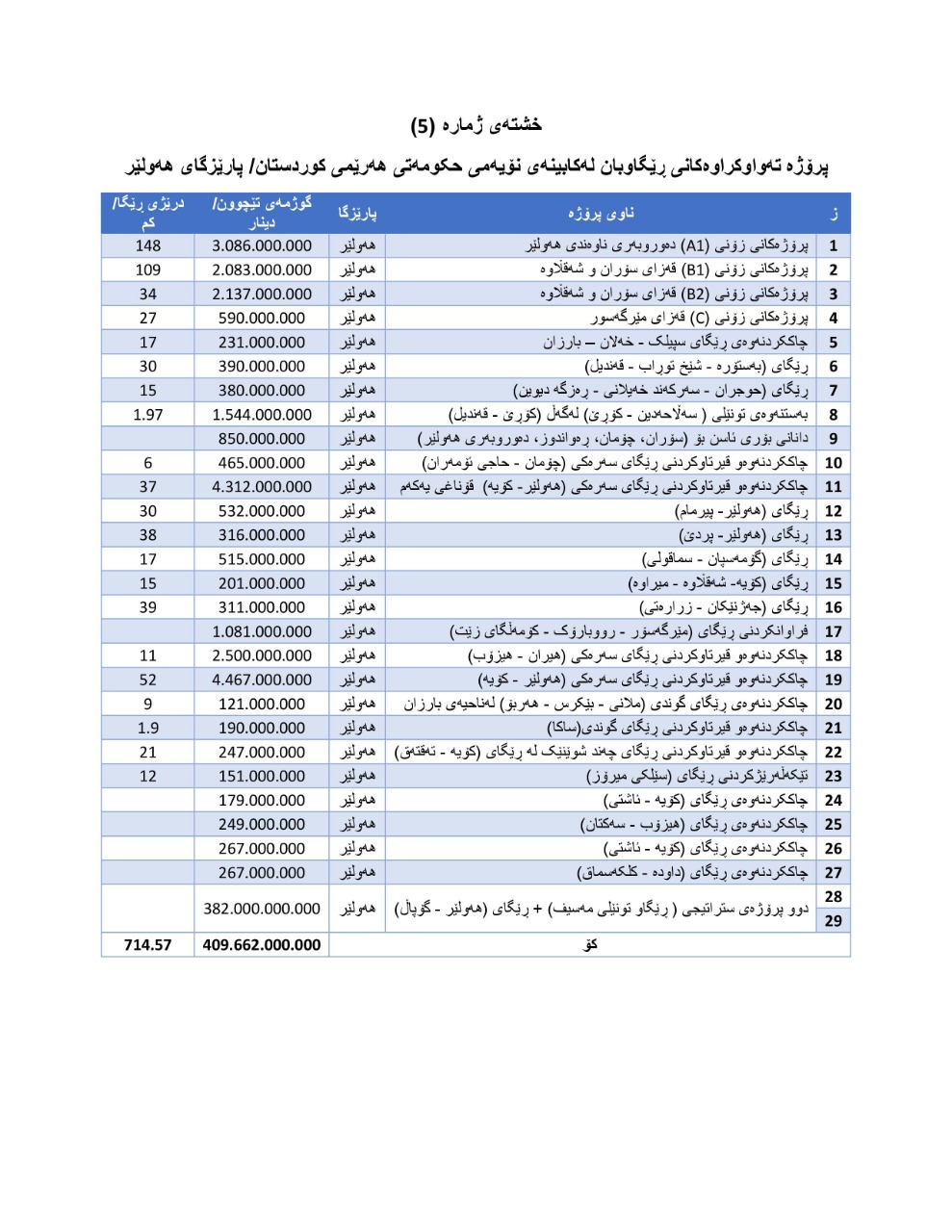 لە کابینەی نۆیەمی حکومەتی هەرێمی کوردستان بە گوژمەی زیاتر لە (700) ملیار دینار (48) پرۆژەی ڕێگاوبان تەواو کراوە، كە (667 ملیار) دینار بەرێژەی (95%) لە هەولێر و دهۆك و (5%)ی لە سلێمانی گەرمیان خەرجكراوە، كە (38) پرۆژەی لە هەولێرو دهۆك و (10) پرۆژەی لە سلێمانی گەرمیان جێبەجیچكرداوە.