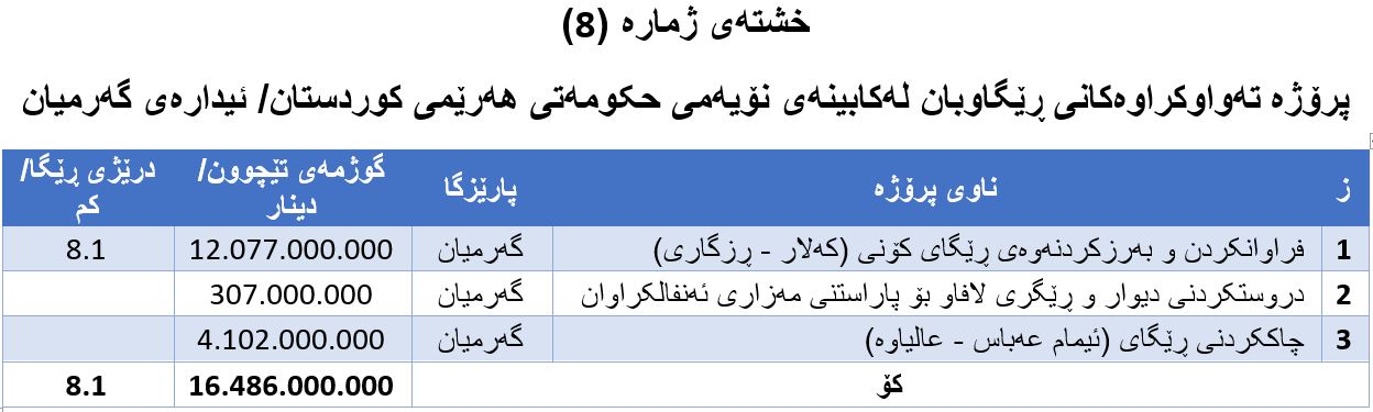 چوارەم: پرۆژە تەواوکراوەکانی ڕێگاوبان لە ئیدارەی گەرمیان