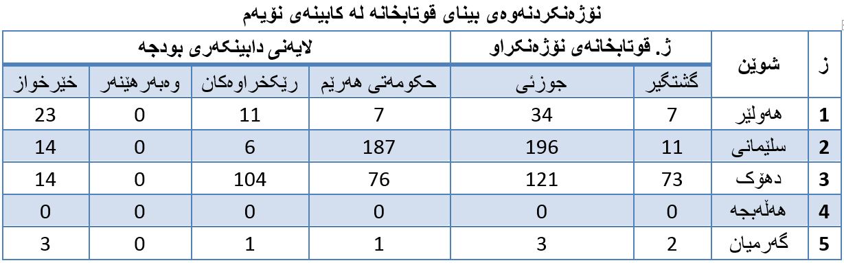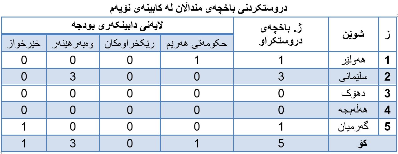 1. لە هەرێمی کوردستان تەنها (5) باخچەی منداڵان دروستکراوە، (1) باخچەیان حکومەتی هەرێمی تەمویلی کردووە، (4) باخچەکەی دیکەیان خێرخواز و وەبەرهێنەران دروستیان کردووە. (بڕوانە خشتەی ژمارە (2)).