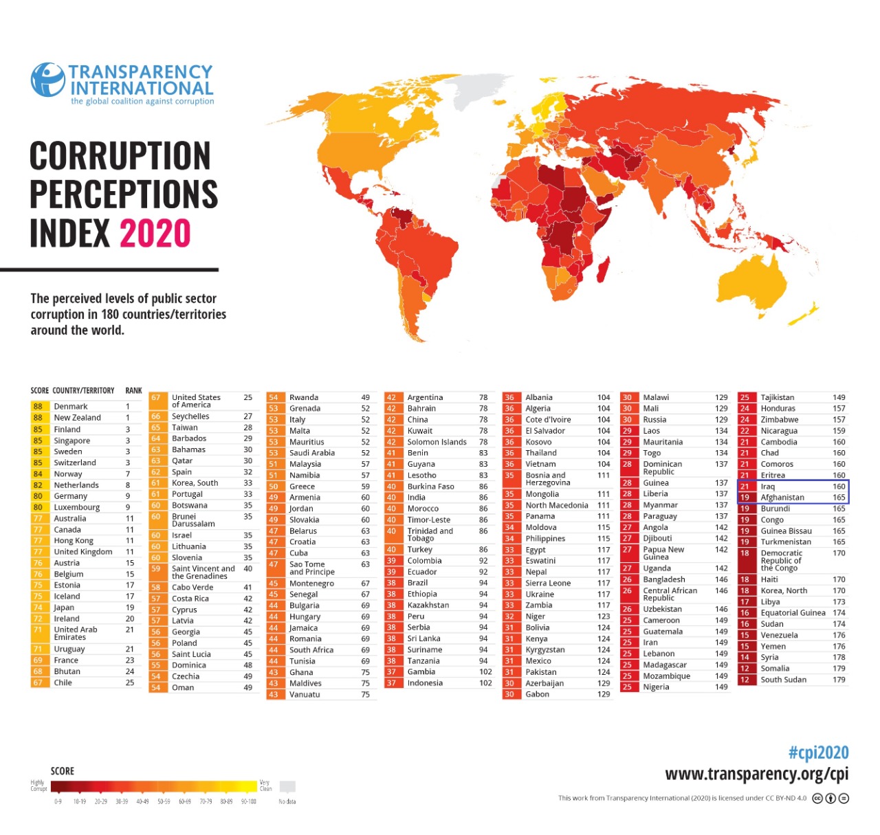 هەر بەپێی بەپێی ڕاپۆرتی رێكخراوی شەفافیەتی نێودەوڵەتی بۆ ساڵی ٢٠٢٠، ئەفغانستان لە ڕیزبەندی وڵاتانی گەندەڵدا لە پێش عێراقەوەیەو لەسەر ئاستی جیهان لەکۆی (١٨٠) وڵات، رانکی (165)پێدراوەو لە پلەی (16)یەمی وڵاتانی گەندەڵی جیهاندایە، لەكۆی (100) نمرەی پێوەری رێكخراوەكە تەنها (19) نمرەی پێدراوە.