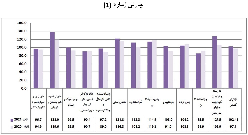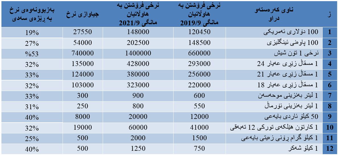 جیاوازی نرخی بەشێک لە شمەک و دراوو پێداویستییەکانی هاوڵاتیان لە ماوەی نێوان مانگی (٩)ی 2019 بۆ مانگی (9)ی 2021 بە ڕێژەیەکی بەرچاو بەرزبوونەتەوە، (100) دۆلاری ئەمریکی (19%) و نرخی (1) تۆن شیش (53%) و نرخی (1) مسقاڵ زێڕی عەیار (21) لە (33%) (1) لیتر بەنزینی موحەسەن (33%) و کارتۆنێک هێلکە (32%) و فەردەیەک ئاردی بایەعی (40%) و کیلۆیەک ڕۆن (25%)... نرخیان بەرزبووتەوە.