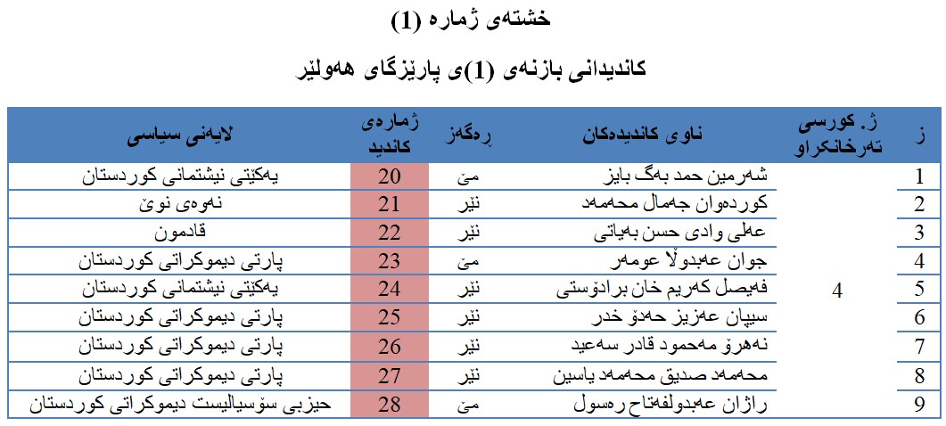 2. لە بازنەی (١)ی هەولێر (گۆڕان، کۆمەڵ، یەکگرتوو) هیچ کاندیدێکیان نییەو تەنها لایەنەکانی (پارتی، یەکێتی، نەوەی نوێ، سۆسیالست و قادیمون) کاندیدیان هەیە.