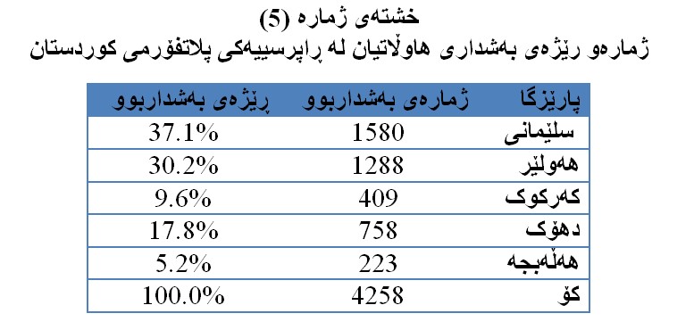5. هاوکات جگە لە سەنگی پارتە سیاسییەکان لە هەڵبژاردنی ٣٠ی ٩ی ٢٠١٨، نوێترین ئامار و ڕاپرسییەکی (پلاتفۆرمی کوردستان بۆ پرسە نیشتمانییەکان) کە لە مانگی ٨ی ٢٠٢١ لەسەر ئاستی پارێزگاکانی (هەولێر، سلێمانی، دهۆک، هەڵەبجە، کەرکوک)ئەنجام دراوە دەخەینەڕوو.