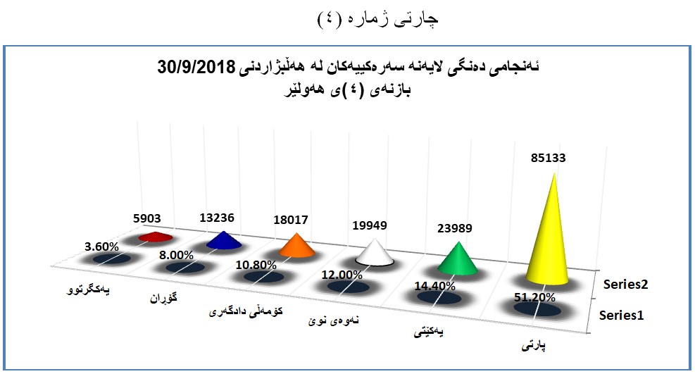 ژمارەی دەنگی لایەنە سەرەکییەکانی پارێزگای هەولێر لەسەر بنەمای هەڵبژاردنی ٣٠ی ٩ی٢٠١٨بۆ پەرلەمانی پەرلەمانی کوردستان لەم بازنەیەی هەڵبژاردن بەم شێوەیەن (بڕوانە چارتی ژمارە (٤))