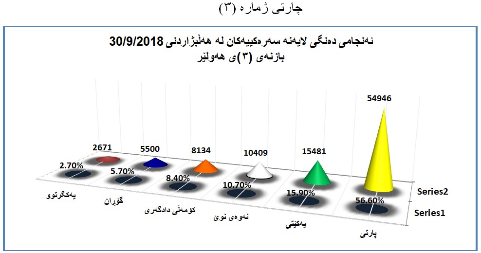 ژمارەی دەنگی لایەنە سەرەکییەکانی پارێزگای هەولێر لەسەر بنەمای هەڵبژاردنی ٣٠ی ٩ی٢٠١٨بۆ پەرلەمانی پەرلەمانی کوردستان لەم بازنەیەی هەڵبژاردن بەم شێوەیەن (بڕوانە چارتی ژمارە (٣))