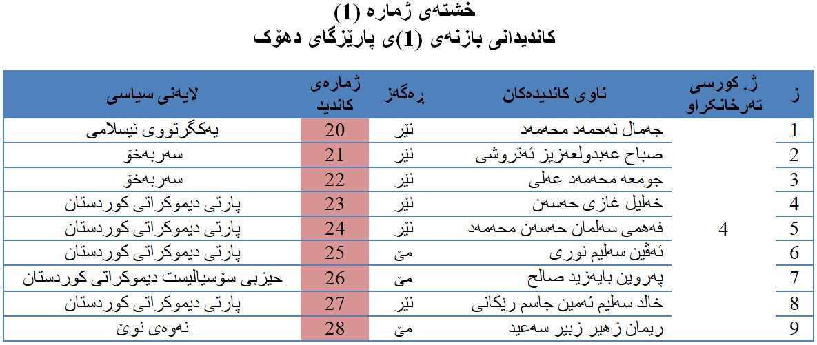 بازنەی (1): کە ناسێنراوە بە بازنەی (دهۆک + ئامێدی)، لەم بازنەیەدا (9) کاندید کە لە (3) ئافرەت و (6) پیاو پێکهاتوون، (7) کاندیدیان سەربە (4) پارتی سیاسین و (2) کاندیدیان بەناوی کاندیدی سەربەخۆوە تۆمار کراون و ڕکابەری دەکەن بۆ بەدەستهێنانی (4) کورسی تایبەت بە بازنەکە، بەپێی یاسای هەڵبژاردنی ئەنجومەنی نوێنەرانی عێراق دەبێت یەکێک لە کاندیدە سەرکەوتووەکان لە ڕەگەزی مێ بێت. (بڕوانە خشتەی ژمارە (1))