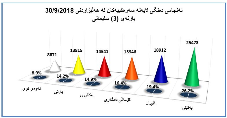 ژمارەی دەنگی لایەنە سەرەکییەکانی پارێزگای سلێمانی لەسەر بنەمای هەڵبژاردنی ٣٠ی ٩ی٢٠١٨بۆ پەرلەمانی پەرلەمانی کوردستان لەم بازنەیەی هەڵبژاردن بەم شێوەیەن (بڕوانە چارتی ژمارە (3))