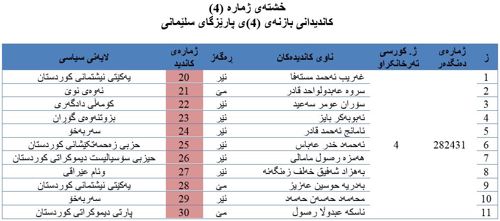 بازنەی (4): کە ناسێنراوە بە بازنەی (پشدەر + ڕانیە + دوکان) زیاتر لە (282) هەزار کەس مافی دەنگدانی هەیە، لەم بازنەیەدا (11) کاندید کە لە (3) ئافرەت و (8) پیاو پێکهاتوون و (9) کاندیدیان سەربە (8) پارتی سیاسین و (2) کاندیدیان بەناوی کاندیدی سەربەخۆوە تۆمار کراون و ڕکابەریدەکەن بۆ بەدەستهێنانی (4) کورسی تایبەت بە بازنەکە، بەپێی یاسای هەڵبژاردنی ئەنجومەنی نوێنەرانی عێراق دەبێت یەکێک لە کاندیدە سەرکەوتووەکان لە ڕەگەزی مێ بێت. (بڕوانە خشتەی ژمارە (4))