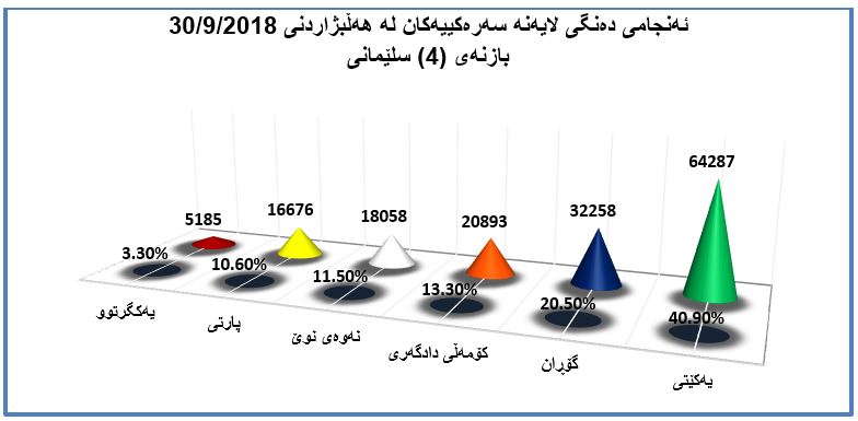 ژمارەی دەنگی لایەنە سەرەکییەکانی پارێزگای سلێمانی لەسەر بنەمای هەڵبژاردنی ٣٠ی ٩ی٢٠١٨بۆ پەرلەمانی پەرلەمانی کوردستان لەم بازنەیەی هەڵبژاردن بەم شێوەیەن (بڕوانە چارتی ژمارە (4))