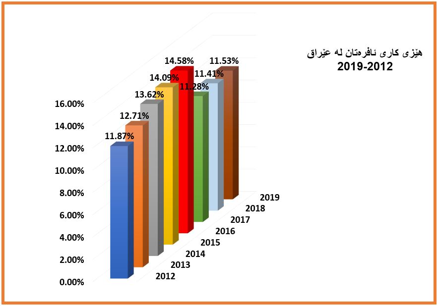 وەک پێشتر ئاماژەمان پێدا، بەپێی ئامارە فەرمییەکان لە ساڵی 2020 ڕێژەی بێکاری بە (%13.74) تۆمار کراوە، لەسەر ئاستی لەنێو چینی گەنجان و لاواندا و ڕێژەی بێکاری بۆ ڕەگەزی نێر بە (10%) تۆمار کراوە، بەڵام بۆ ڕەگەزی مێ تێکڕای بێکاری ئامارەکە زۆر گەورەترەو سێ هێندەی ڕەگەزی نێرەو دەگاتە (%30.59). (بڕوانە چارتی ژمارە (3))کە ڕێژەی بەرزی بێکاری لە نێو ئافرەتاندا نیشان دەدات لە ماوەی ساڵانی (2012-2018).