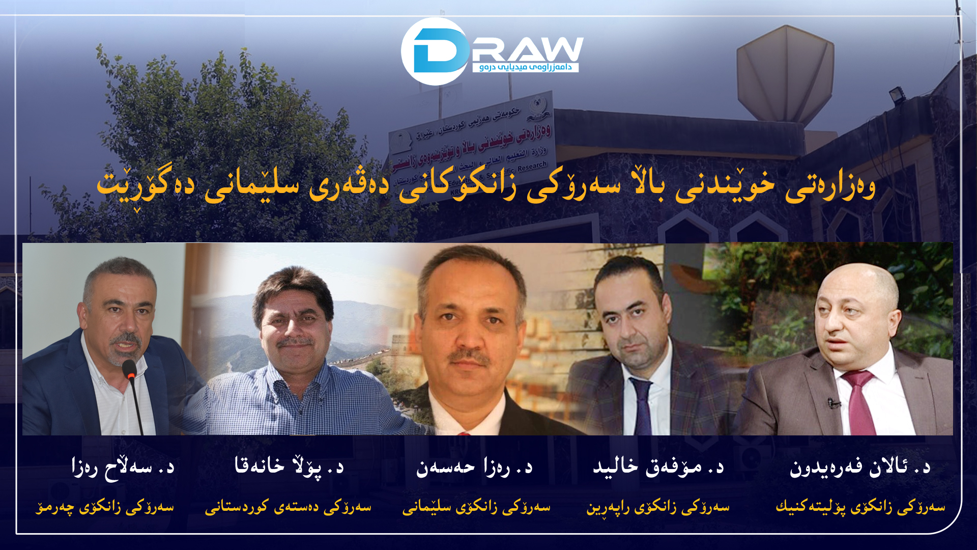 وەزارەتی خوێندنی باڵا سەرۆكی زانكۆكانی دەڤەری سلێمانی دەگۆڕێت كە بەشێكیان ماوەی زیاتر لە 10 ساڵە لەو پۆستەدان و لە قۆناغی داهاتووشدا سەرجەم راگرەكان و ئەوانەی ماوەی یاساییان تەواوبووە دەگۆڕێت.