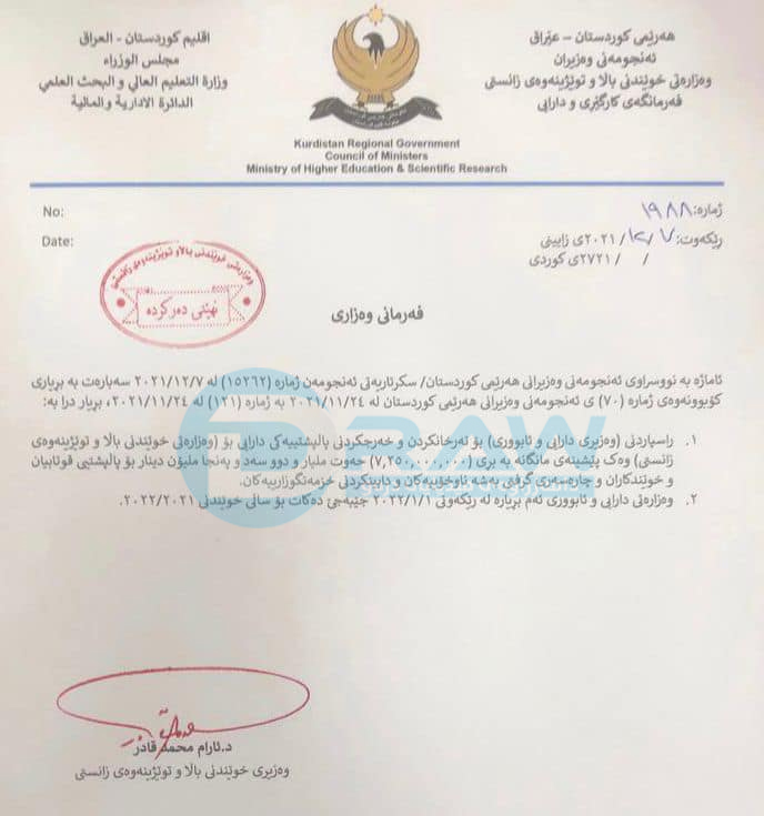 خەرجكردنی ئەم بڕە پارە نوێیە بۆ وەزارەتی خوێندنی باڵا، لە سەرەتای ساڵی نوێیوە تاوەكو كۆتایی وەرزی خوێندن بەردەوام دەبێت.