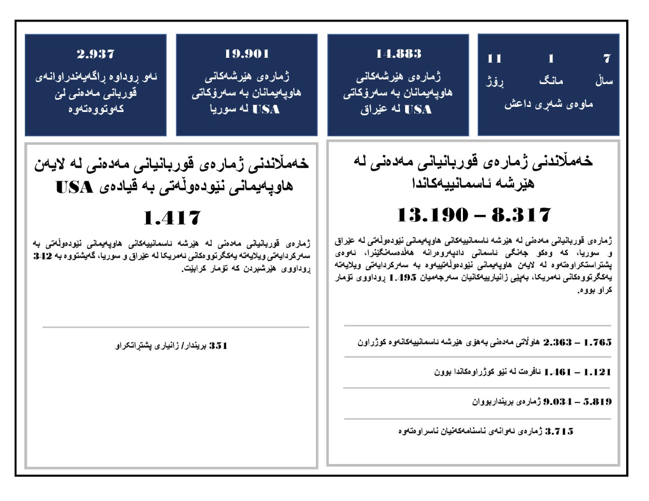 لەئەنجامی بەداوادچونەکانی گەیشتووە بەو ئەنجامەی کۆی قوربانیانی سڤیل لەماوەی حەوت ساڵی ڕابردوودا لە نێوان (8 هەزار 318) بۆ (13 هەزار و 190) قوربانییە، کە بەشی زۆریان لە شەڕی ئازادکردنەوەی پارێزگای موسڵ لە عێراق و شاری ڕەقە لە سوریا کوژراون (بڕوانە گرافیک)ەکە.
