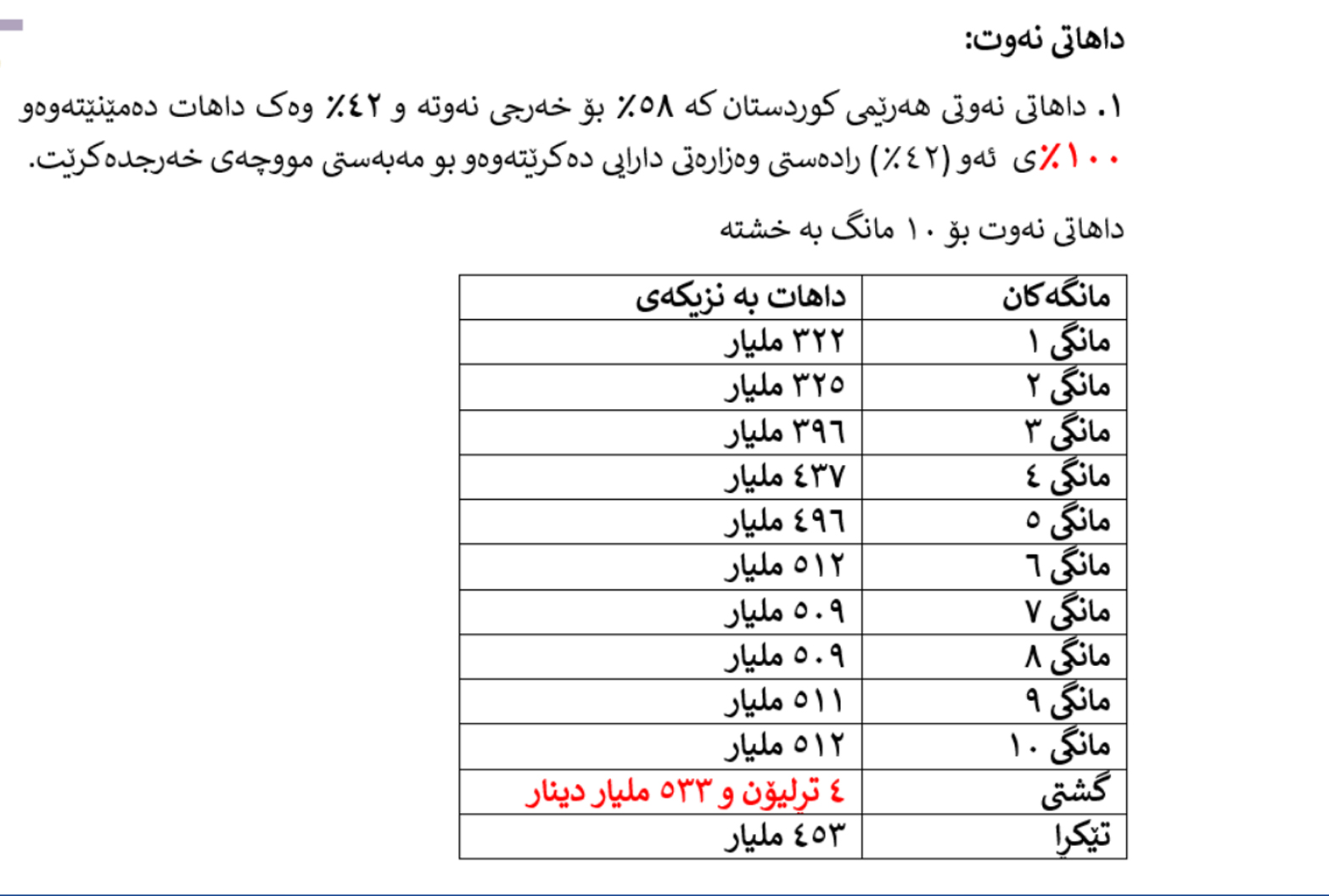 • داهاتی نەوتی هەرێم رێژەی 58%ی بۆ خەرجی نەوت دەڕواتو 42%ی وەكو داهات دەمێنێتەوە، رێژەی 100%ی ئەوەی وەكو داهات دەمێنێتەوە رادەستی وەزارەتی دارایی دەكرێتو بۆ موچە خەرجدەكرێت.